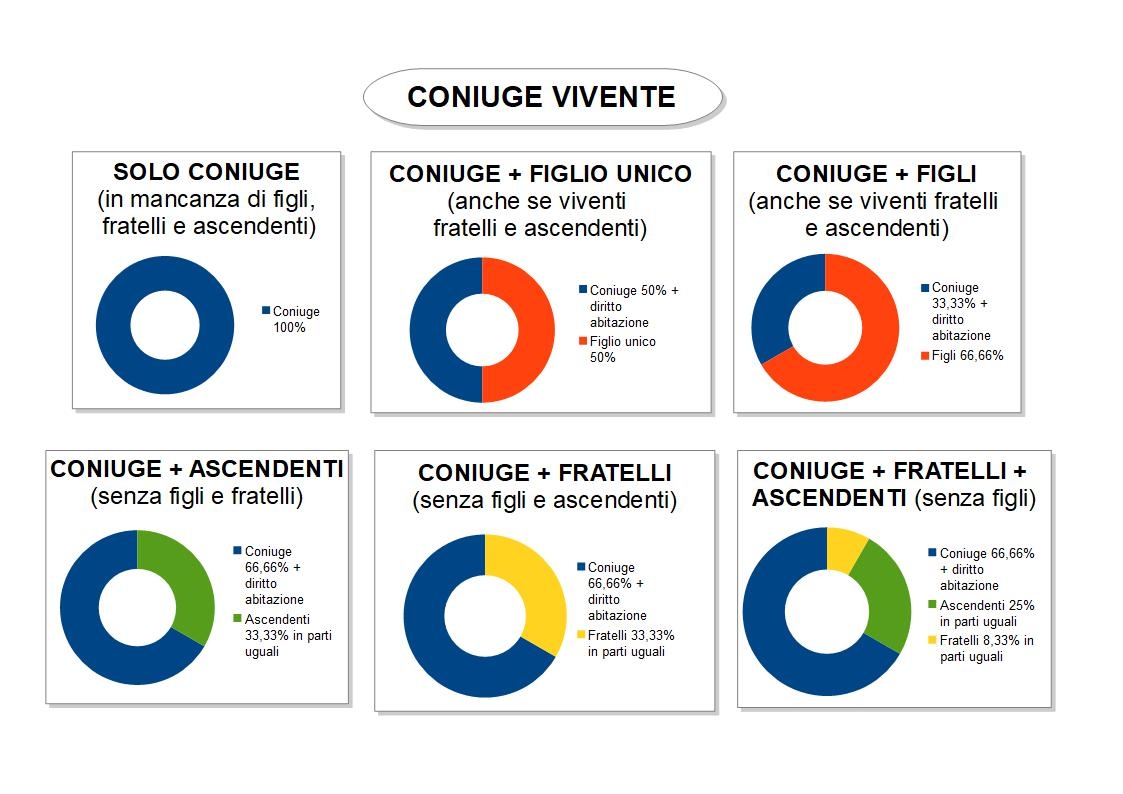 Entriamo nel dettaglio e vediamo come funziona la successione legittima (senza testamento). Per farlo ci serviamo di questi due grafici: il primo spiega cosa accade in presenza di un coniuge vivente; il secondo in assenza del coniuge.